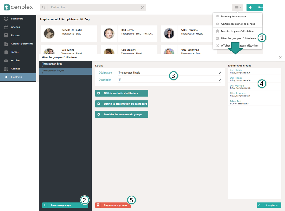 La boîte de dialogue qui s'ouvre est divisée en trois colonnes. La colonne de gauche affiche tous les groupes existants à l'aide de leur titre et indique le nombre de membres de ce groupe. De nouveaux groupes peuvent être créés en cliquant sur "Nouveau groupe" (2). Les détails du groupe d'utilisateurs sélectionné sont gérés dans la colonne du milieu et identifiés par une désignation parlante (3). Dans la colonne de droite, il y a une liste de tous les membres du groupe sélectionné (4). Le groupe d'utilisateurs sélectionné peut également être supprimé (5).